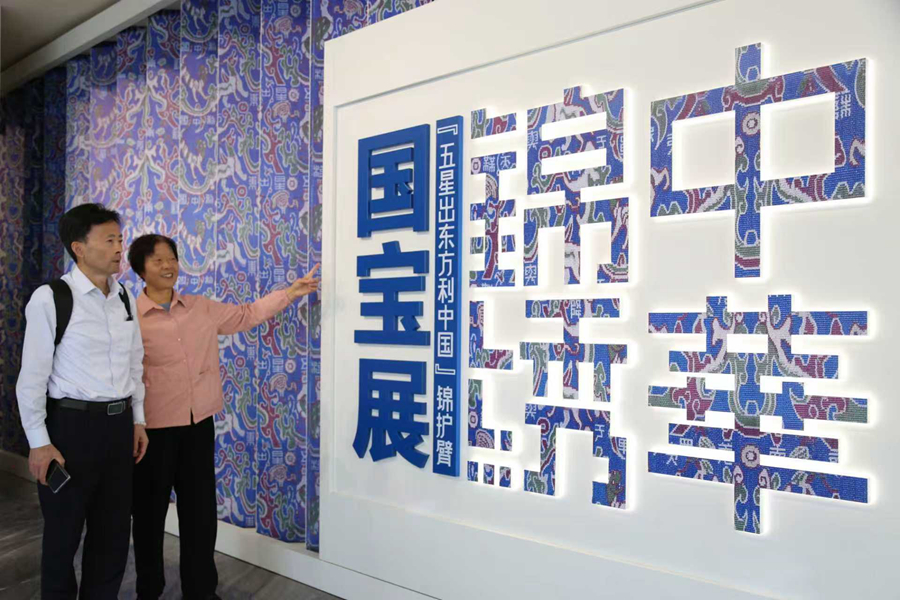 游客在参观中华锦绣——“五星出东方利中国”锦护臂国宝展。【来源:新华网】