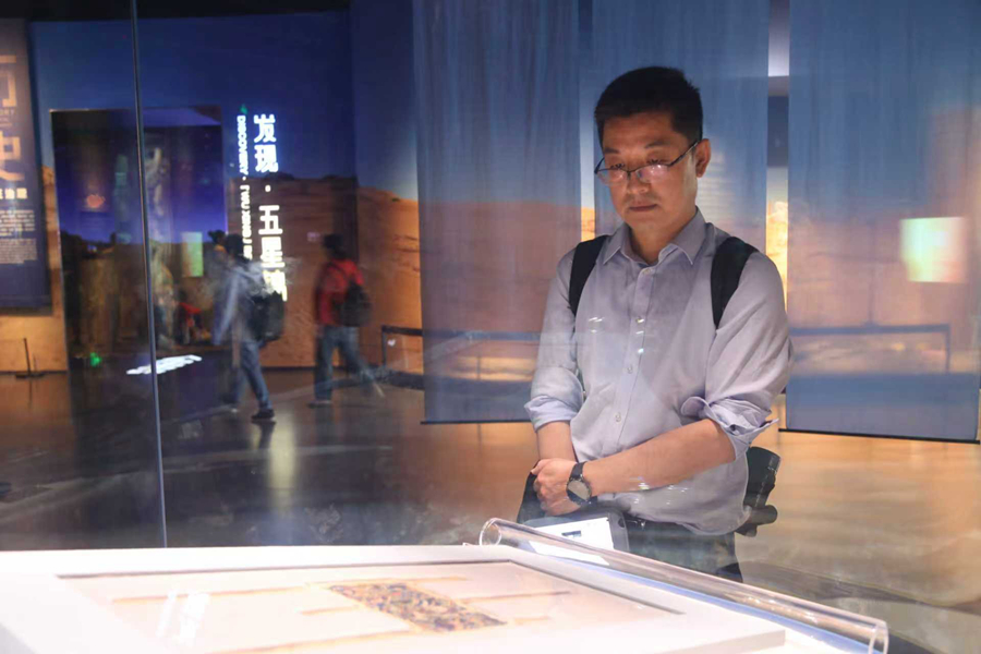 游客正望着“五星出东方利中国”锦护臂沉思。【来源:新华网】