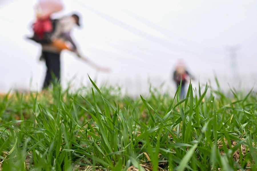 2026年2月4日,农民在江苏省昆山市锦溪镇长云村麦田间喷打化肥。【来源:新华网】